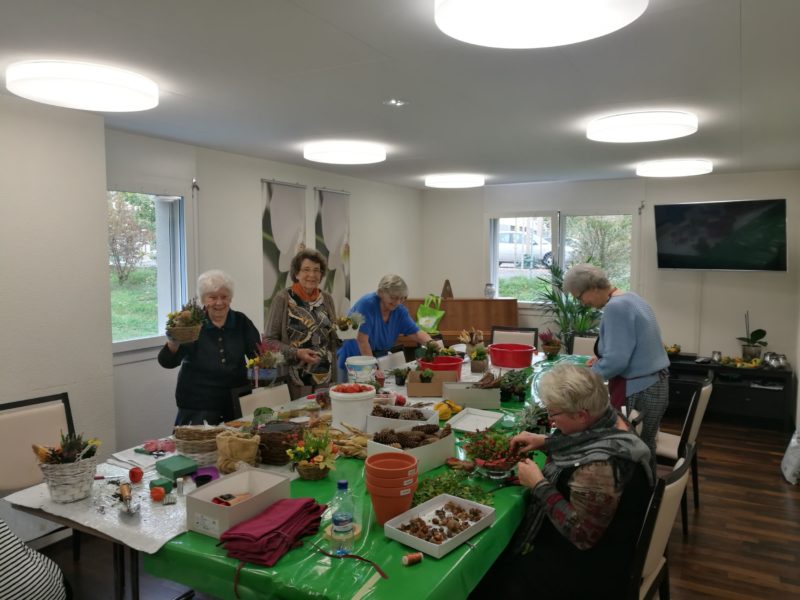 An einem typischen Herbsttag dekorierten unsere Seniorinnen mit unserer Aktivierungstherapeutin diverse Schalen und Vasen. Die Gestecke sehen prächtig herbstlich aus!
